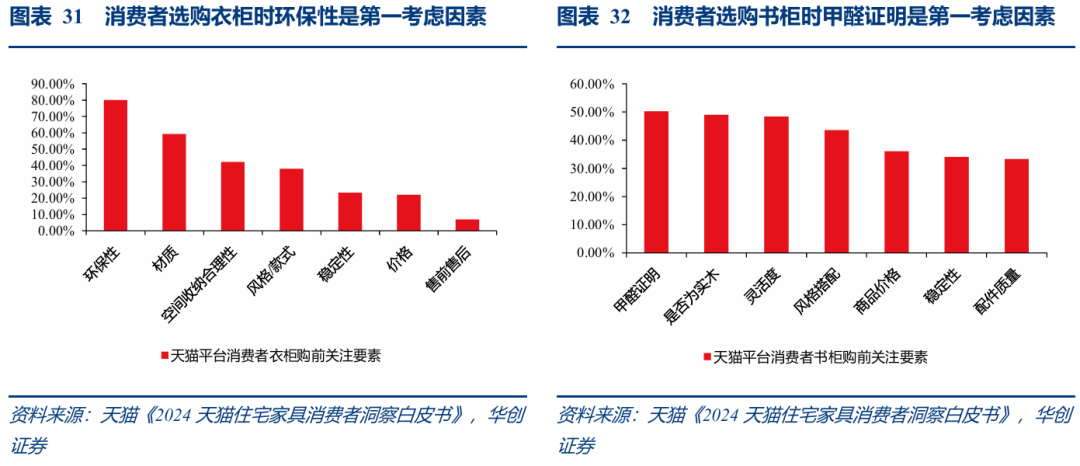 零售市场关注品牌消费价值,环保性已成为消费者选购板材下游产品的第一要素。根据天猫对住宅家具消费者偏好的调研,79.89%的消费者在选购木制衣柜时会考虑环保性,50.23%的消费者在选购书柜时会考虑商品是否提供甲醛证明,二者均位列所有因素中第一。