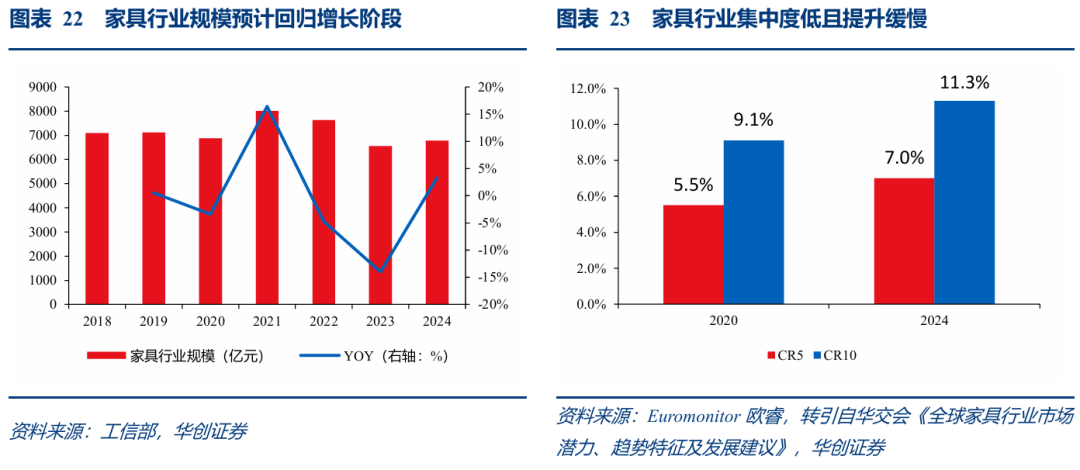 下游B端市场“大行业、小公司”,竞争格局分散藏广阔机遇。1)工信部公布的规模以上家具行业营收来看,2018-2024年,受房地产行业下行因素影响,家具市场规模呈现波动态势,但2024年重新实现同比正增长,达6772亿元。家具市场体量大,未来将稳定增长,Statista预测2025-2029年家具市场增速可达2.51%。2)从竞争格局看,2024年家具行业CR5/CR10分别为7%/11.30%,较四年前仅提升1.5/2.2pcts,集中度提升缓慢。综上,家具市场全屋定制大品牌本身市占率有限,小B市场中长期内仍为B端市场主体,数量众多且份额高,在大品牌渗透率更低的乡镇渠道内,中小家具厂将占据很大比例,可为板材销售贡献广阔空间,兔宝宝装饰材料业务下沉市场增量可观。