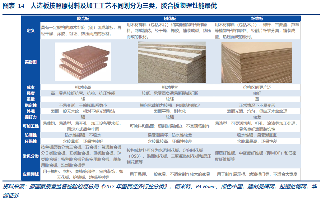 (二)胶合板适用于传统木工体系,刨花板受全屋定制大厂喜爱