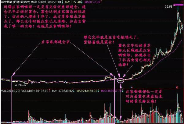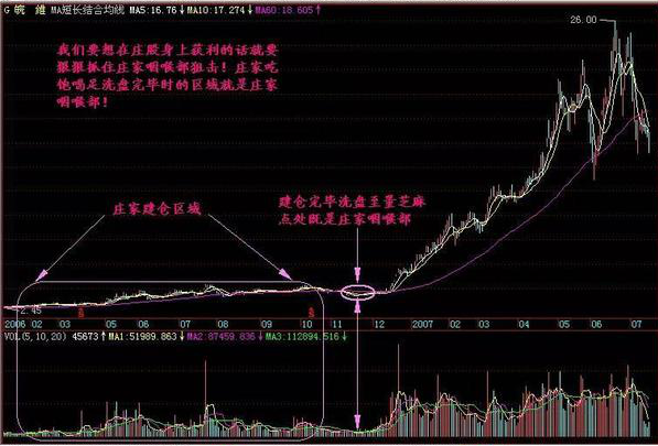 小结:只要有证券市场存在的地方,就不能杜绝主力行为的存在,而对于庄股来说,他建仓完毕,并经历过震仓洗盘等一系列底部区间的准备工作,那么这就是主力十月怀胎完毕的时候,这个时候主力已经没有了退路,拉高出货成了他唯一的选择,这个时候就称为“主力咽喉部”!