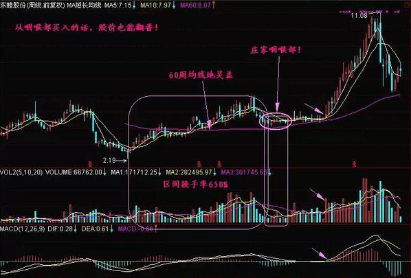 第一点:周K线60周均价线必须得出现地灵盖,否则不容易出现三线顺上的拉升行情,那么之前的量芝麻区域就不一定是庄股咽喉部;