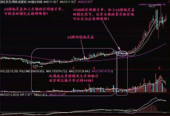 在确定60周均价已经出现地灵盖,且区间换手率达到或超过250%以上时出现的量芝麻区域,可认定为庄股咽喉部!