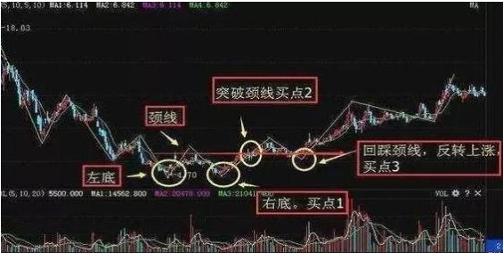 (2)放量上涨时突破颈线阻力位,为第二买入点位。