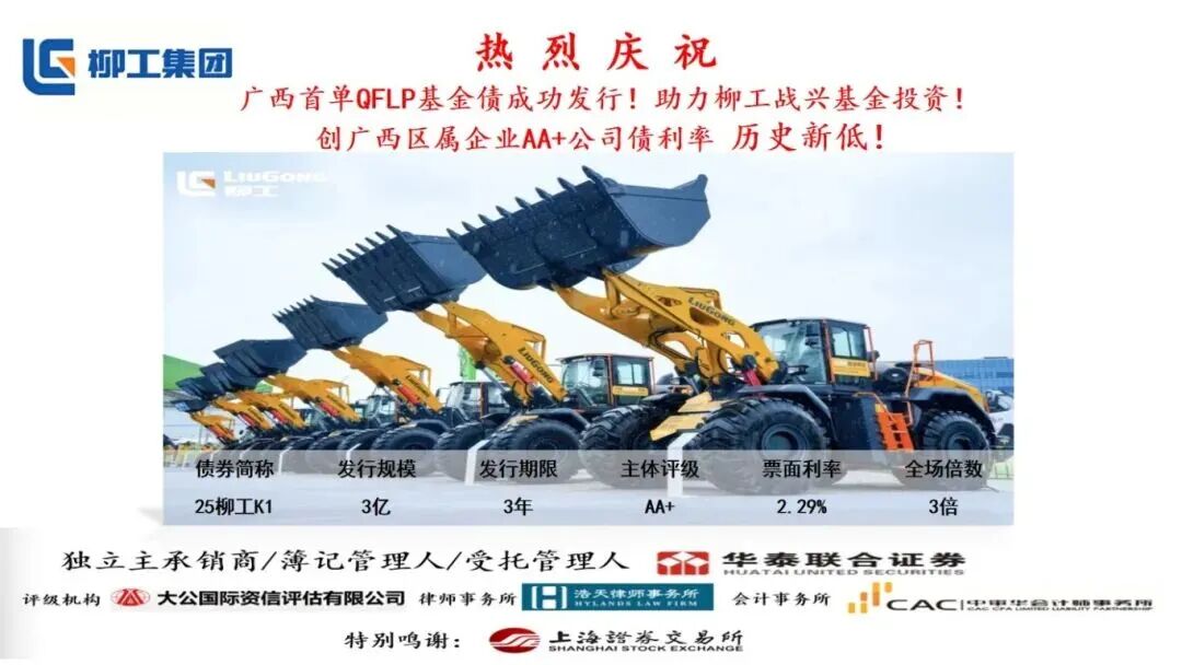 12月11日,柳工集团2025年面向专业投资者公开发行科技创新公司债券(第一期)在上海证券交易所成功发行。本次债券发行金额3亿元,期限3年,发行利率2.29%,全场倍数3倍,为广西首单QFLP(合格境外有限合伙人)基金债,创下广西区属企业AA+公司债利率历史新低,也刷新了柳工集团自身债券发行利率记录。