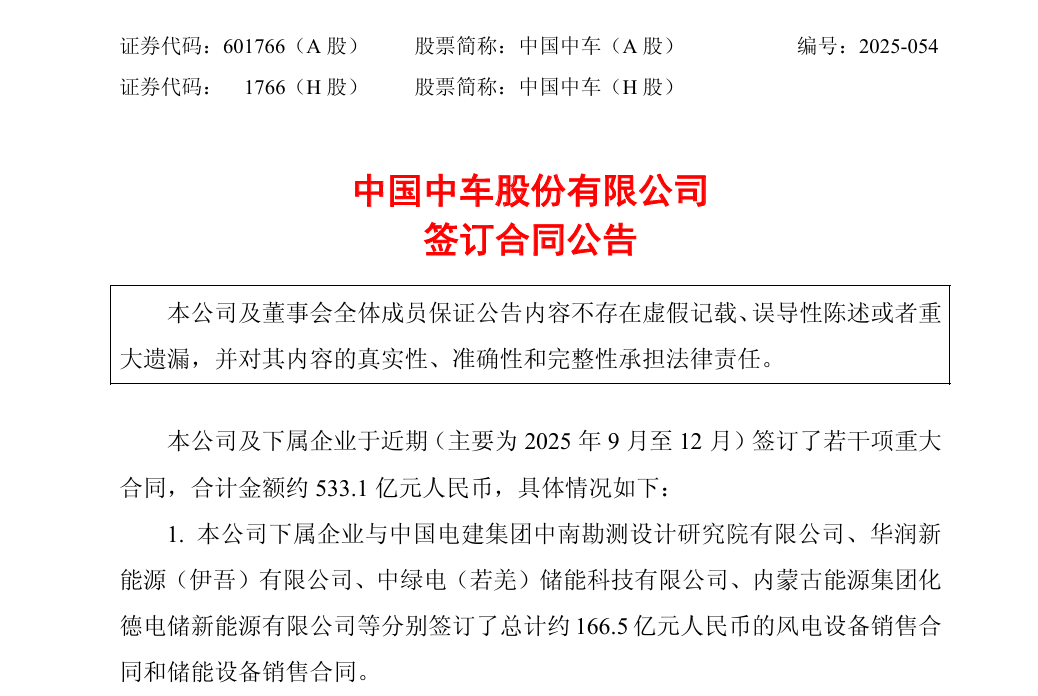 公告披露,中国中车及下属企业于近期(主要为2025年9月至12月)签订了若干项重大合同,合计金额约533.1亿元。