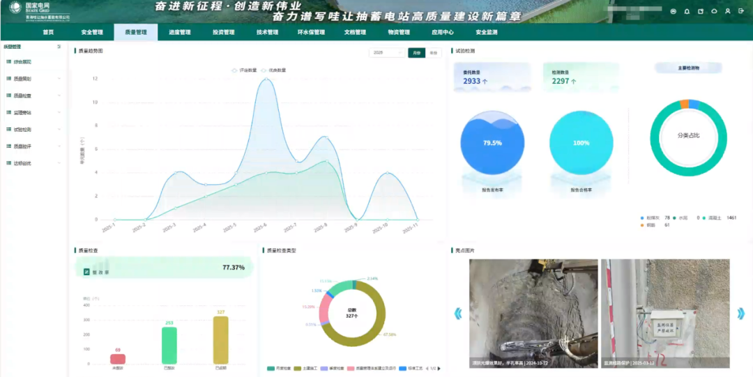 哇让数字化平台由易用视点实施建设,自2024年上线以来,质量管理模块完全实现质量标准化管理,强化原材料从进场检验到工序验收的全过程管控,严格执行“三检制”,做到业务线管理线双贯通,检测项目全覆盖、质量责任可追溯。通过业务信息及文件的自动化收集、汇总、统计分析,实现对施工现场重要环节和关键过程的有效管控,实现现场全面、全员、全过程、全方位应用,提升抽水蓄能工程质量管理数字化水平。