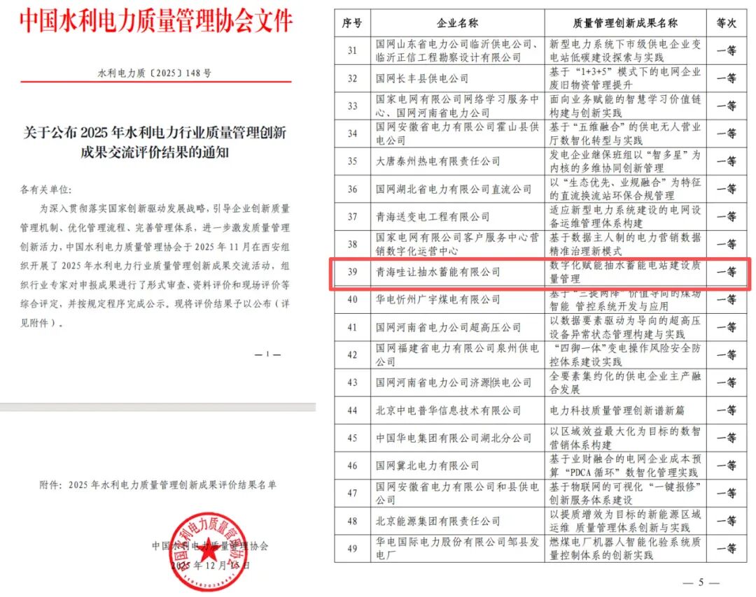 12月15日,中国水利电力质量管理协会公布2025年水利电力管理创新成果交流评价成果,由广哈通信控股子公司易用视点承建、青海哇让抽水蓄能有限公司提报的《数字化赋能抽水蓄能电站建设质量管理》创新成果在476项参赛成果中脱颖而出,荣获“一等”评价。