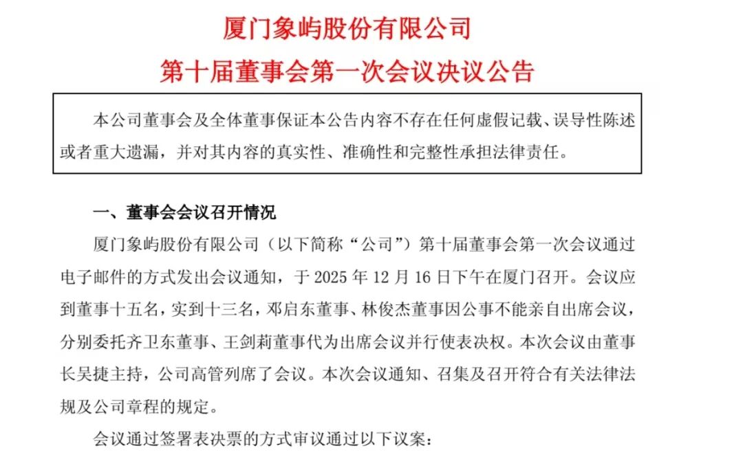 12月16日,厦门象屿股份有限公司第十届董事会第一次会议于2025年12月16日在厦门召开,会议选举吴捷为董事长,齐卫东为副董事长;并聘任齐卫东兼任公司总经理。