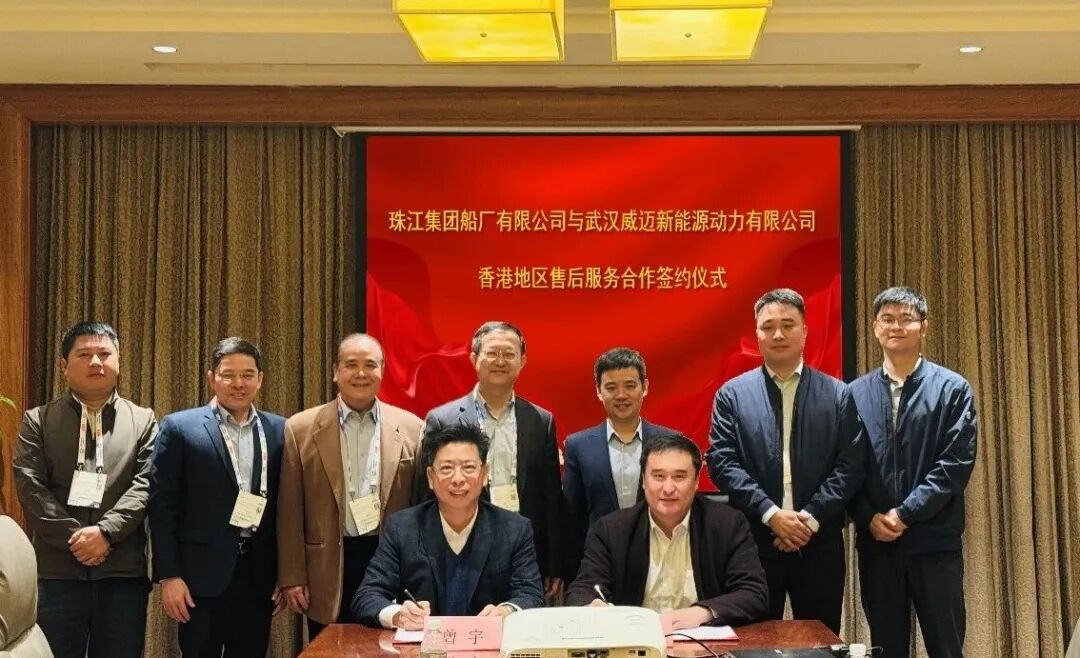 近日,珠江船务所属珠江集团船厂有限公司(以下简称:珠江船厂)与中船七一二所所属武汉威迈新能源动力有限公司(以下简称:威迈动力)签署了香港地区新能源动力系统售后服务合作协议。珠江船务常务副总经理胡军,珠江船厂总经理曾宇,威迈动力总经理周凌辉、副总经理孟得东等参加签约仪式。