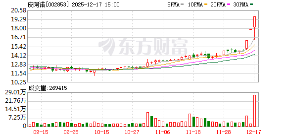 12月17日,皮阿诺以18.11元的价格高开,随后震荡走高,午盘后封住涨停板,报19.65元。算上前一日交易日(12月16日),复盘后的两天时间里,皮阿诺股价上涨了21%。