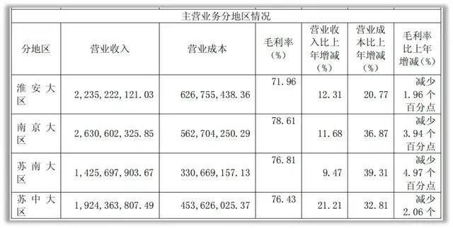 之所以能够在江苏省内取得强势的增长,主要是因为今世缘采取了不惜让利于经销商的方式扩大规模、抢占经销商资源这样的策略。反映在毛利率上,从2024年年报中就可以看出,今世缘在江苏省内所有区域业务毛利率都有所下降。