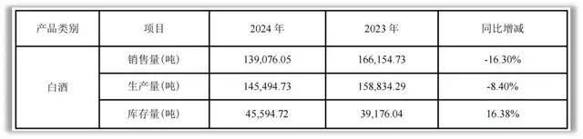 从产销量指标来看,早在2024年洋河的产销量就发生了双双下滑,其中去年销量为13.91吨,同比下滑16.3%;产量为14.55吨,同比下滑8.4%。