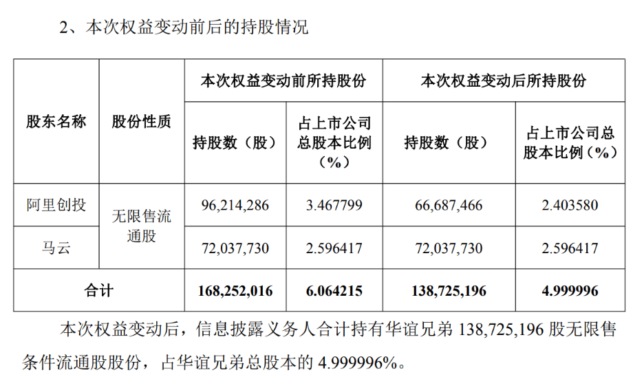 华谊兄弟表示,本次减持有利于公司股权结构的稳定,不会对公司正常经营产生不利影响。本次变动之后,阿里创投及其一致行动人马云不再是华谊兄弟持股5%以上股东。本次权益变动不会导致公司控股股东、实际控制人发生变更。