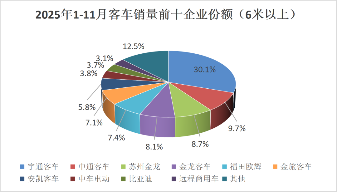 2025年1-11月客车销量排行榜(6米以上客车销量排名)数据显示,宇通客车、中通客车、金龙客车、福田欧辉、安凯客车、中车电动、比亚迪、远程商用车,八家企业同比实现正增长,其中,福田欧辉、安凯客车、远程商用车,三家企业同比增幅均超五成。具体来看,宇通客车1-11月客车累销近3.5万辆,同比增长2.1%,市场份额为30.1%;中通客车1-11月销车11226辆,同比增长10.5%,市场份额为9.7%;苏州金龙1-11月累销10045辆,同比增长-1.3%,市场份额为8.7%;金龙客车1-11月累销9394辆,同比增长17.8%,市场份额为8.1%。