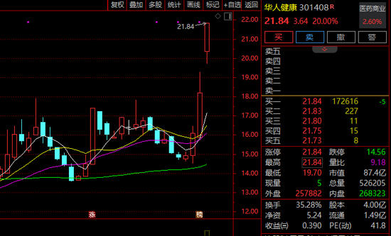 医疗商业概念持续走强,截至发稿,华人健康(301408)20%涨停,鹭燕医药、重药控股涨停,达嘉维康、塞力医疗、漱玉平民跟涨。