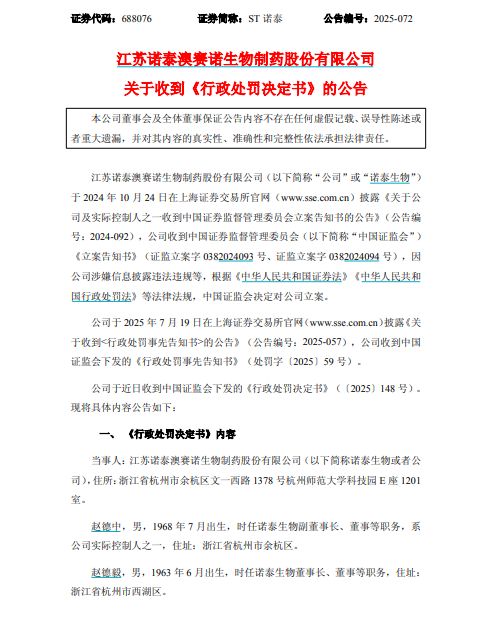 12月17日晚间,江苏诺泰澳赛诺生物制药股份有限公司(688076.SH)发布关于收到《行政处罚决定书》的公告。公告显示,中国证监会调查认定,ST诺泰在上市首年即通过一笔缺乏商业实质的技术转让交易虚增利润,粉饰报表,并基于此虚假财务数据成功实施可转债发行,最终因信息披露违法违规及欺诈发行行为,公司及相关责任人总计被处以73200万元罚款。与此同时,上海证券交易所对ST诺泰及相关人员予以公开谴责,并限制其五年内再融资资格。此次处罚也为近期持续发酵的ST诺泰信披违规案画上了阶段性句号。