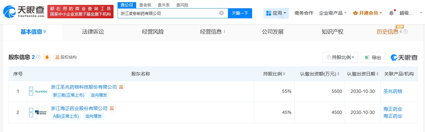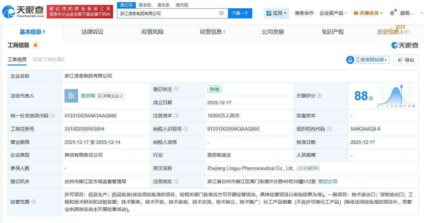 每经AI快讯,天眼查App显示,近日,浙江凌愈制药有限公司成立,法定代表人为张洪瑶,注册资本1亿元人民币,经营范围包括药品生产、药品批发、技术进出口、货物进出口等。股东信息显示,该公司由浙江圣兆药物科技股份有限公司、海正药业(600267)共同持股。