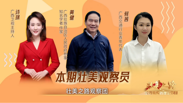 壮美观察团:(左到右)广西卫视主持人诗琪、广西壮族自治区人民政府参事、知名学者作家黄健、广西交通行业青年代表何茜