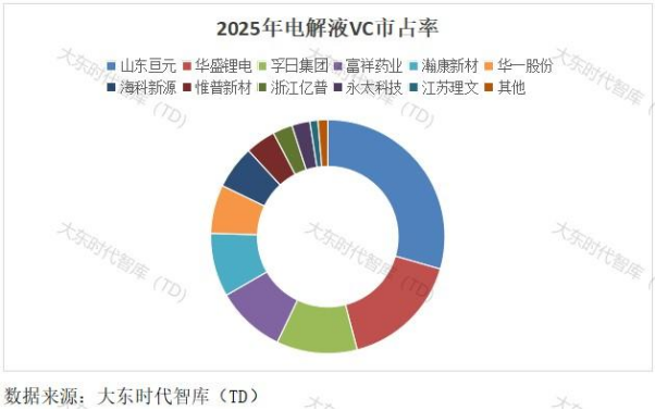 根据广东省电池行业协会产业研究中心调研数据显示,2025年1-10月,电解液VC市场占有率排名第一的企业为山东亘元市,占率达到29.47%;排名第二的企业为华盛锂电,市占率达到16.49%;排名三至七的企业分别为孚日集团、富祥药业、瀚康新材、华一股份、海科新源。