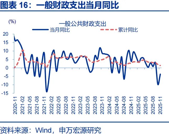财政收支分化格局,部分缘于收入端基数扰动与土地财政持续拖累。基数角度看,2024年11月广义财政收入同比延续修复,当月同比11%,较10月大幅提升5.5个百分点,形成一定高基数压力。叠加2025年11月一般公共预算收入当月同比仅-0.02%(前值3.2%),土地财政低迷态势未改。收入端增速转弱进一步制约整体财力扩张空间。