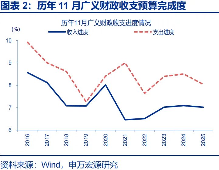 11月广义财政收支“支出改善、收入承压”的分化态势,支出进度较10月明显提速。11月,广义财政支出同比-1.7%,较10月降幅明显收窄17.5个百分点;广义财政收入同比-5.2%,较10月-0.6%进一步下滑4.6个百分点。从支出进度看,11月广义财政支出预算完成度回升至8%,较10月5.6%的明显提升,显现年末赶进度的发力特征。