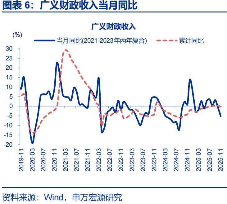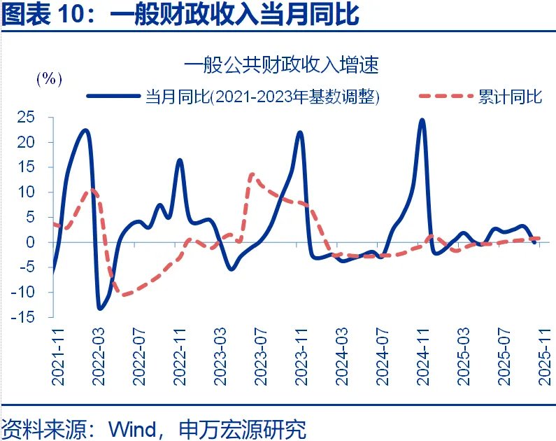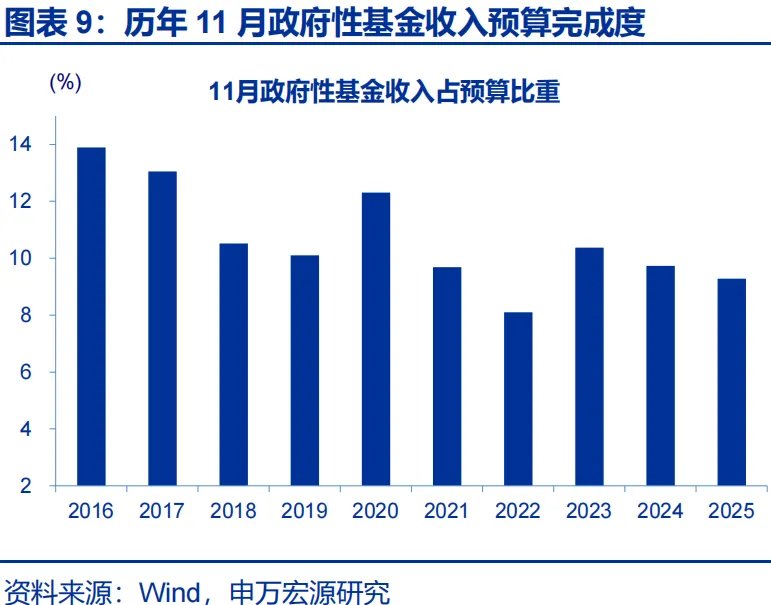 一般财政收入回落,拖累广义财政收入增速下滑。2025年11月广义财政收入同比-5.2%,较10月同比下降4.6个百分点;其中,政府性基金收入同比-15.8%,一般财政收入同比-0.02%。从预算完成度看,2025年11月广义财政收入预算完成7%,与2024年同期的7.1%以及过去五年平均的7%基本持平。