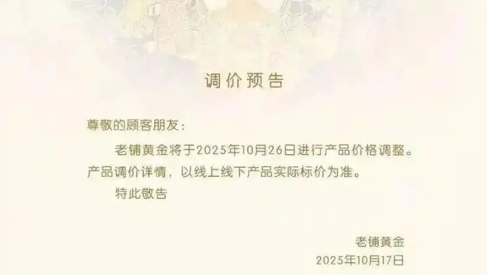 周大福并非唯一宣布涨价的品牌。此前10月17日,老铺黄金发布调价预告,称将于10月26日进行产品提价调整。产品调价详情,以线上线下门店产品实际标价为准。据了解,这已是这家备受瞩目的高端黄金品牌在今年内的第三次官方调价。