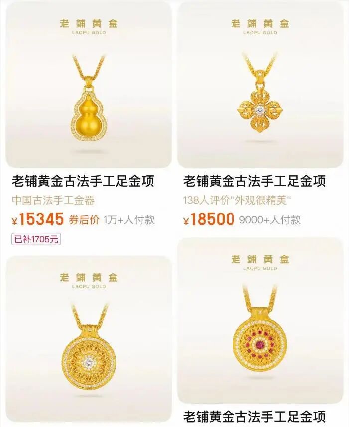 禧宝在老铺黄金京东、天猫旗舰店注意到,多款古法足金饰品价格明显上调,其中部分热销款价格涨幅超过两成。而且,一些素金款首饰下架或者显示无货,偶尔补货很快又售罄。