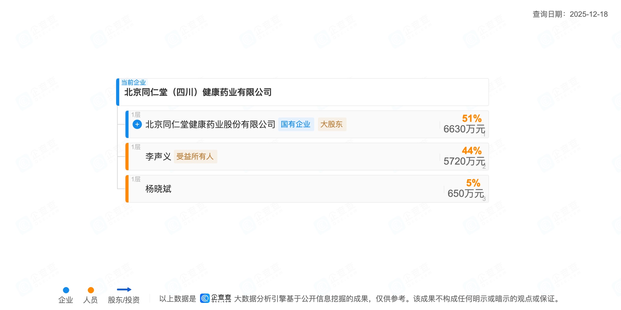 这一事件再度将拥有356年历史的中华老字号推至舆论风口。上海市消保委于12月15日正式约谈生产商与经销商,生产商安徽哈博药业承认产品中未添加南极磷虾油,而经销商北京同仁堂(四川)健康药业则在约谈中“回避问题推脱责任”。同仁堂健康随即发布声明,称该产品未经授权擅自突出使用“北京同仁堂'字样”,已启动司法程序。然而,天眼查信息显示,四川健康药业正是同仁堂健康持股51%的控股子公司,是北京同仁堂集团的成员企业。