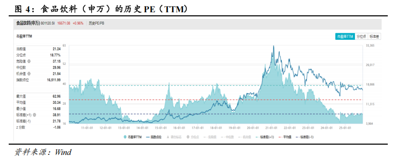 截至2025年12月12日,食品饮料(申万)的PE(TTM)为21.24倍,在-1X标准差附近,位于2010年以来的18.77%分位。