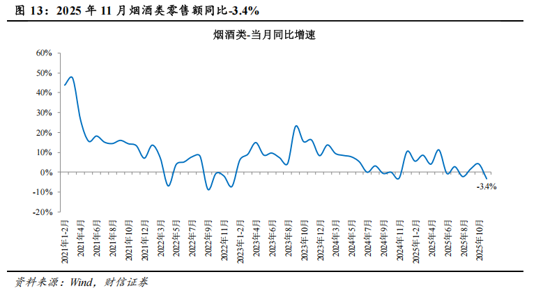 2025年11月,限额以上烟酒类零售额同比下滑3.4%至502亿元,低基数下增速再次转负,主要因高端白酒批价出现显著下跌。1-11月,限额以上烟酒类零售额累计同比增长3.3%。
