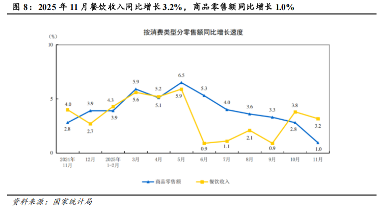 11月份,商品零售额37841亿元,同比增长1.0%,增速较上月下滑1.8个百分点,为连续6个月增速放缓;餐饮收入6057亿元,增长3.2%,增速较上月放缓0.6个百分点。