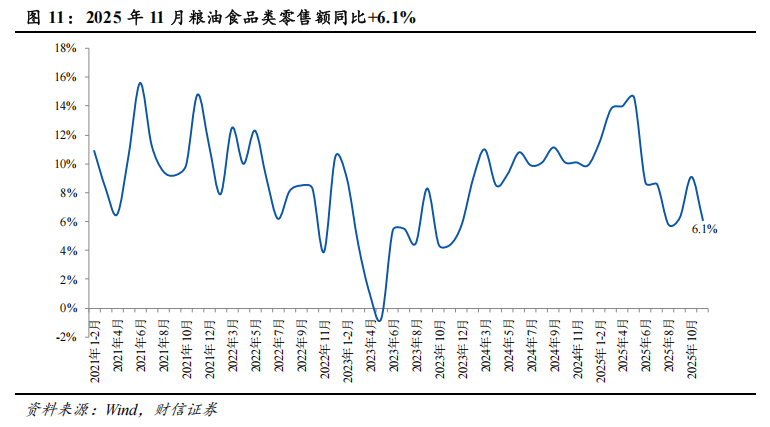 2025年11月,限额以上粮油食品类零售额同比增长6.1%至2060亿元,增速较上月回落3.0个百分点,连续6个月增速低于双位数,存在一定的基数原因。1-11月,限额以上粮油食品类零售额累计同比增长9.9%。