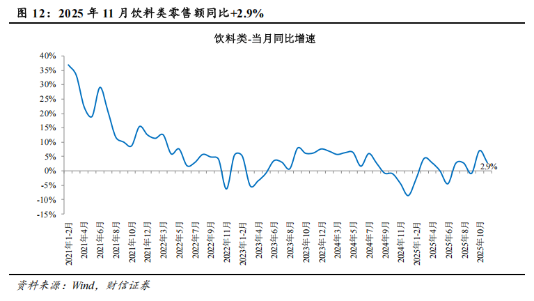 2025年11月,限额以上饮料类零售额同比增长2.9%至269亿元,低基数下,淡季销售表现一般。1-11月,限额以上饮料类零售额累计同比增长1.0%。