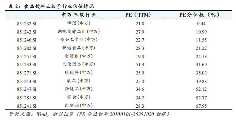 从三级子行业的表现来看,12月以来各细分板块均呈下跌态势。其中,啤酒、调味品和软饮料跌幅较小,其他酒类、烘焙食品和白酒跌幅较深。2025年以来,保健品、软饮料、预加工零食和零食板块涨幅超过5%,而啤酒、白酒、调味品跌幅较大。