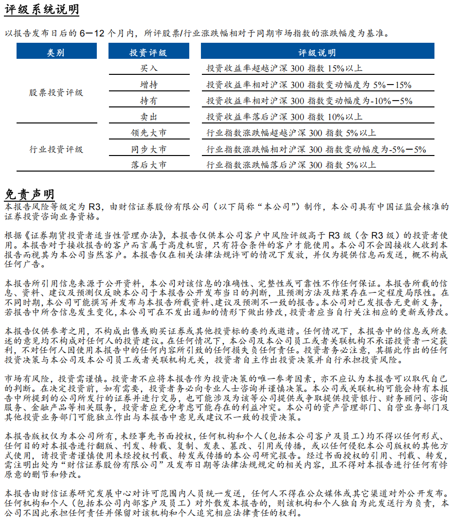 财信证券研究发展中心分为宏观策略、综合金融、大制造、大消费、大周期和TMT等研究团队,研究领域涵盖市场策略、行业研究、公司研究,以及基金、债券研究等,已基本完成A股主要行业及重点上市公司的全覆盖。研究报告除自有研究业务平台及微信公众号外,授权同花顺、Wind、东方财富、证券时报、红网、讯兔科技、中国证券报和朝阳永续刊载或转发。未经授权刊载或转载的,财信证券将追究其相应的法律责任。