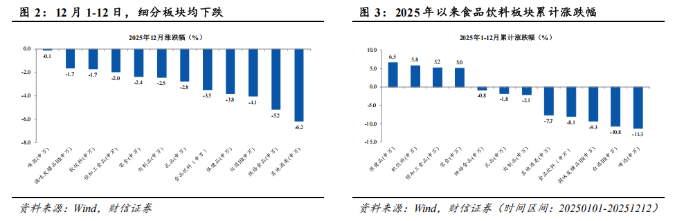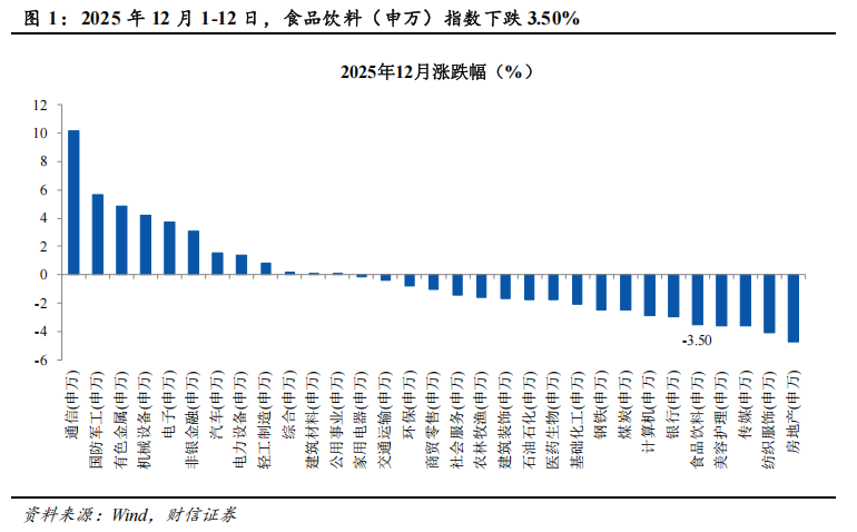 2025年12月以来(12月1-12日),A股市场缩量震荡,受整体三季报业绩承压和近期高端白酒批价持续下跌影响,食品饮料板块走弱,食品饮料(申万)指数下跌3.50%,跑输沪深300指数4.70个百分点,在申万31个一级行业排名第27位。