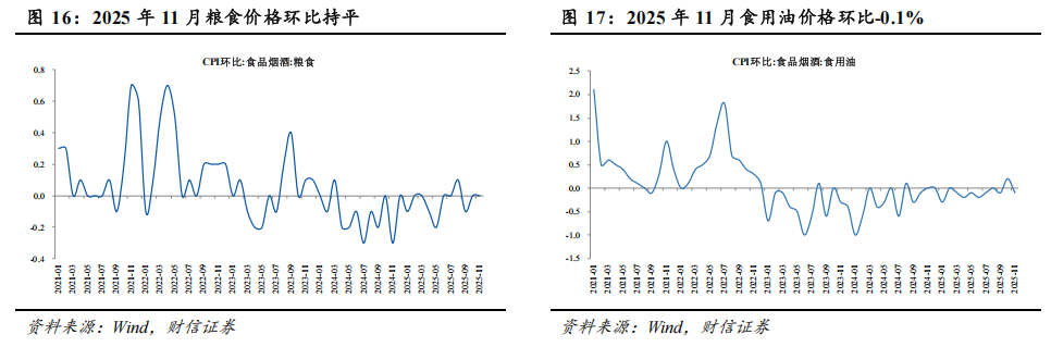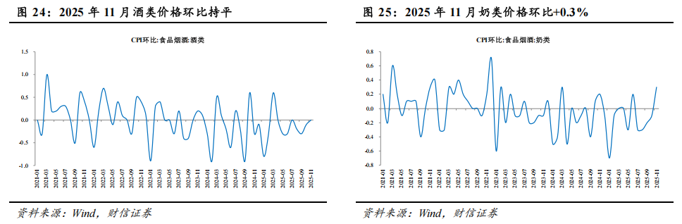从同比看,食品烟酒类价格同比上涨0.3%,影响CPI上涨约0.09个百分点;食品价格由上月下降2.9%转为上涨0.2%,影响CPI同比上拉0.04个百分点。食品中,鲜菜/水产品/鲜果价格分别上涨14.5%/1.5%/0.7%,分别影响CPI上涨约0.31/0.03/0.01个百分点,蛋类/畜肉/粮食价格分别下降12.5%/6.6%/0.4%,分别影响CPI下降约0.08/0.20/0.01个百分点,其中猪肉价格下降15.0%,影响CPI下降约0.21个百分点。