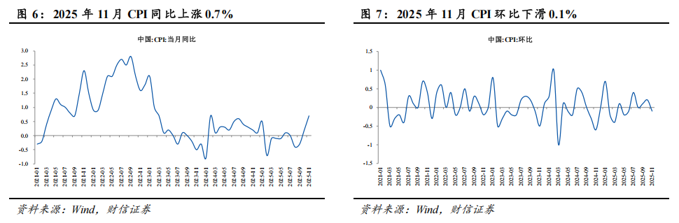 11月,CPI同比上涨0.7%,涨幅比上月扩大0.5个百分点,为去年3月份以来最高,同比涨幅扩大主要是食品价格由降转涨拉动;核心CPI同比上涨1.2%,涨幅连续3个月保持在1%以上。CPI环比下降0.1%,主要受服务价格季节性下降影响。