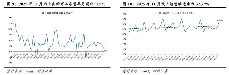 11月,全国网上零售额16666亿元,同比增长5.41%。其中,实物商品网上零售额14209亿元,增长1.51%,占社会消费品零售总额的比重为32.37%,占比呈现显著提升。