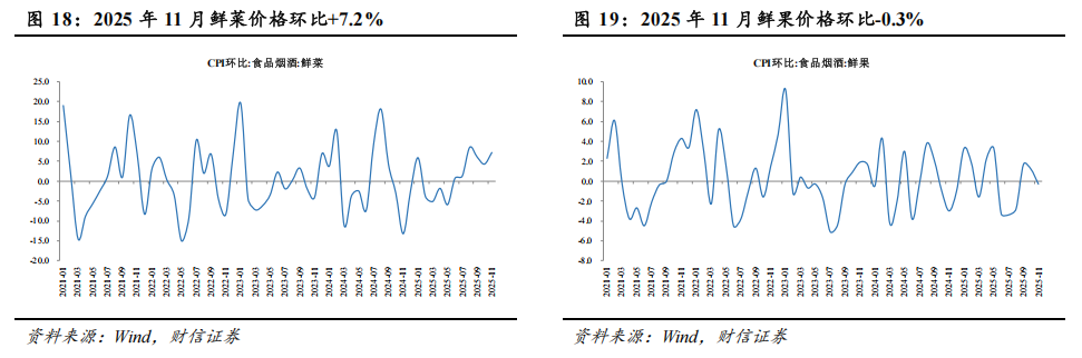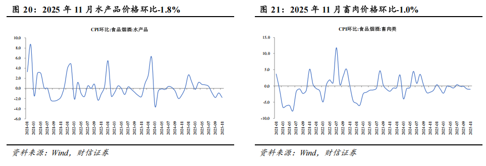 从环比看,食品烟酒类价格环比上涨0.3%,影响CPI上涨约0.07个百分点;食品价格环比上涨0.5%,高于季节性水平0.9个百分点。食品中,受部分地区降雨影响鲜菜生产储运,导致鲜菜价格上涨7.2%,影响CPI上涨约0.17个百分点;水产品/蛋类/畜肉/鲜果价格分别下降1.8%/1.8%/1.0%/0.3%,分别影响CPI下降约0.03/0.01/0.03/0.01个百分点。