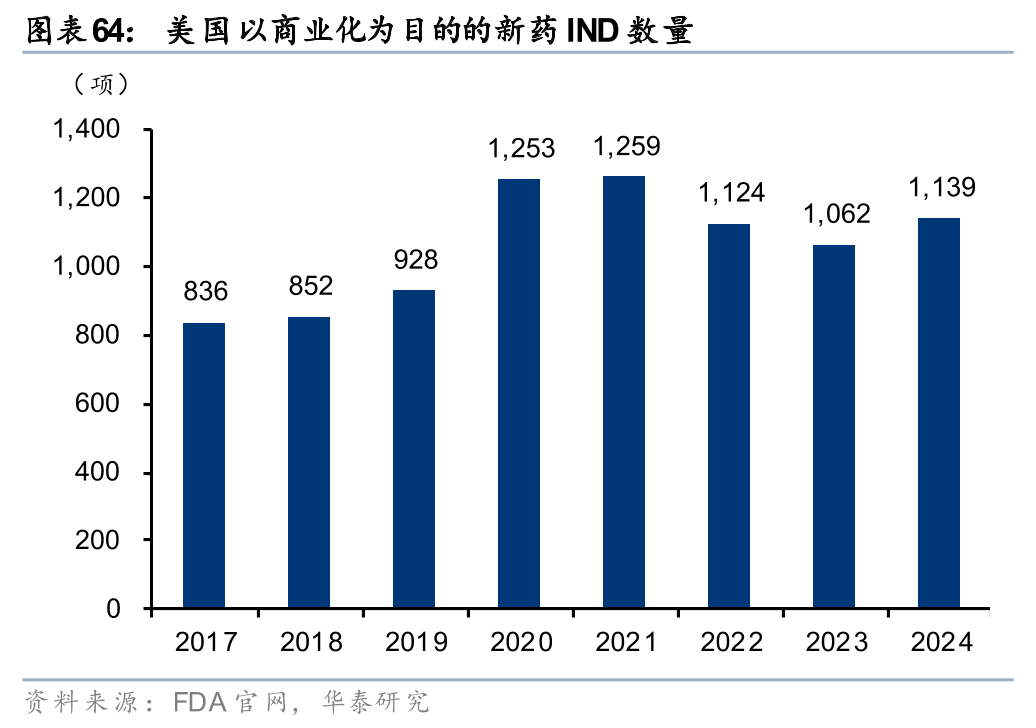 中美IND数量保持高位,新药研发热度持续。中国及美国新药注册活动均整体保持向好态势。根据国家药品监督管理局药品审评中心(CDE)的资料,CDE受理的新药临床试验申请(IND)由2017年的767项快速增长至2021年的2412项(2018-2021年CAGR=33.2%),2022年数量虽受全球生物医药领域投融资活动的阶段性下滑而小幅回落,但2023年已恢复增长,并于2024年提升至3073项的历史新高(2022-2024年CAGR=8.4%);与此同时,根据FDA官网,2024年美国以商业化为目的的新药IND申请数为1139项(yoy+7.3%)。中美市场新药IND受理数均维持高位,进一步证明以中美为代表的全球新药关键市场的研发热度,并有望积极提升相关新药后续商业化阶段的需求空间。