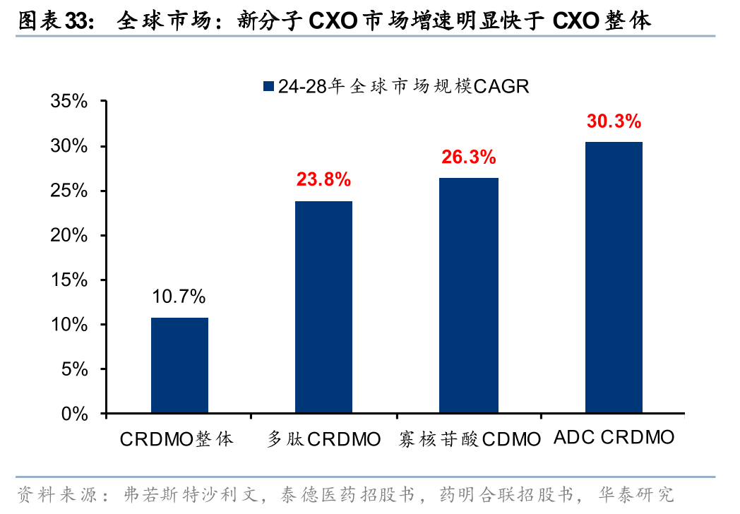 我们在报告中详细分析了新分子对于中国CXO行业的重要机遇。新分子药物技术壁垒更高且往往产能先行(早于订单),对于CXO公司的产能快速扩张能力、人员补充能力、传统小分子领域的开发生产能力(ADC)、及前端业务能力(产业趋势判断能力、卡位能力)等要求较高,这些要素与中国CXO的核心竞争力高度匹配,因此国内供应商竞争力有望保持甚至扩大。