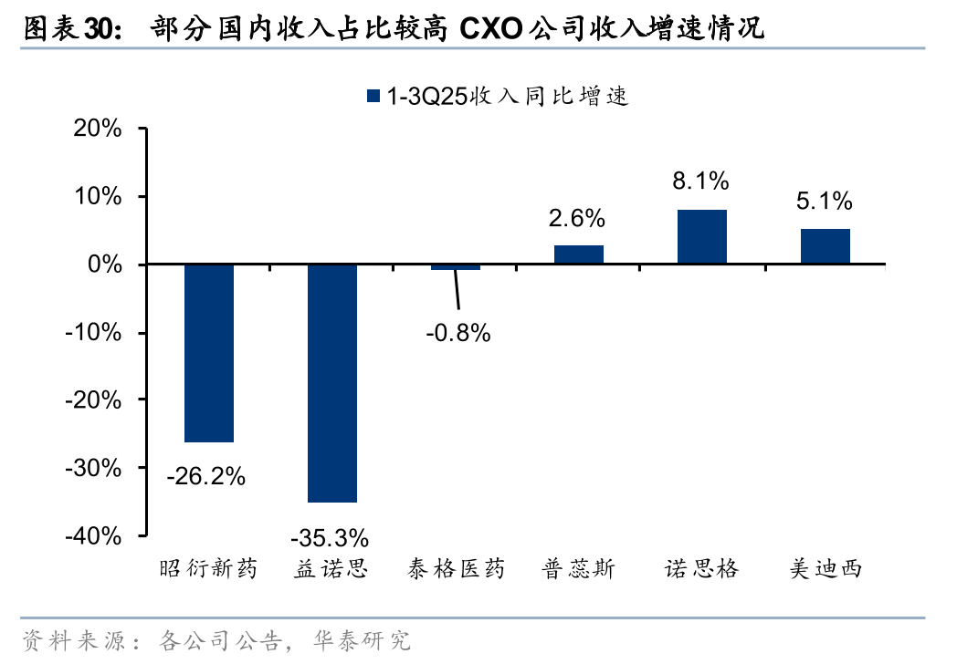 1)外需型CXO:2022-2023年行业投融资强度走弱对于外需型CXO的业绩压力已于2023-2024年逐渐消化。2024年起海外行业投融资规模持续修复(根据动脉橙的资料,2024年全球生物医药领域投融资规模yoy+3.5%,其中海外规模yoy+13.6%),带动外需型CXO收入边际提速;虽2025年来受美联储降息节奏放缓等因素影响,海外行业投融资规模有所下滑(根据动脉橙的资料,1H25全球生物医药领域投融资规模yoy-23.7%,其中海外规模yoy-21.1%),但外需型CXO收入增速仍保持较强韧性。以康龙化成为例,自3Q24以来,公司单季度收入同比增速已整体恢复稳健增长。
