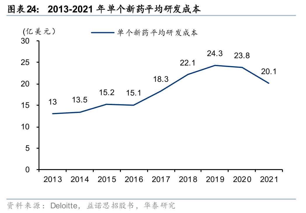 降息环境利好CXO板块需求提升。创新药行业具备“高投入、高风险、长周期”的属性(根据德勤的研究,研发一款新药的平均成本已经从2013年的13.0亿美元增长至 2021年的20.1亿美元),药企尤其是中小Biotech公司的研发资金主要来自历轮的投融资(因普遍缺少商业化带来的现金流),其资金宽裕程度高度依赖利率/融资成本的变化。对于大型制药企业而言,宽松的融资环境、较低的借贷成本也为其收并购、全球化布局扩张提供便利,亦可改善整体市场的流动性。当宏观进入降息周期时,行业借贷成本会降低、市场流动性会提升,利于药企融资金额增加,药企有更多资金用于研发(包括新管线的立项及此前暂停管线的重启),外包需求提升,进而拉动CXO订单的增长。