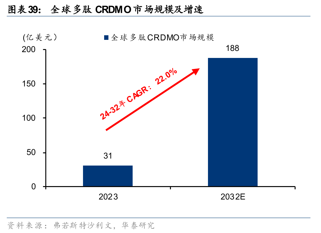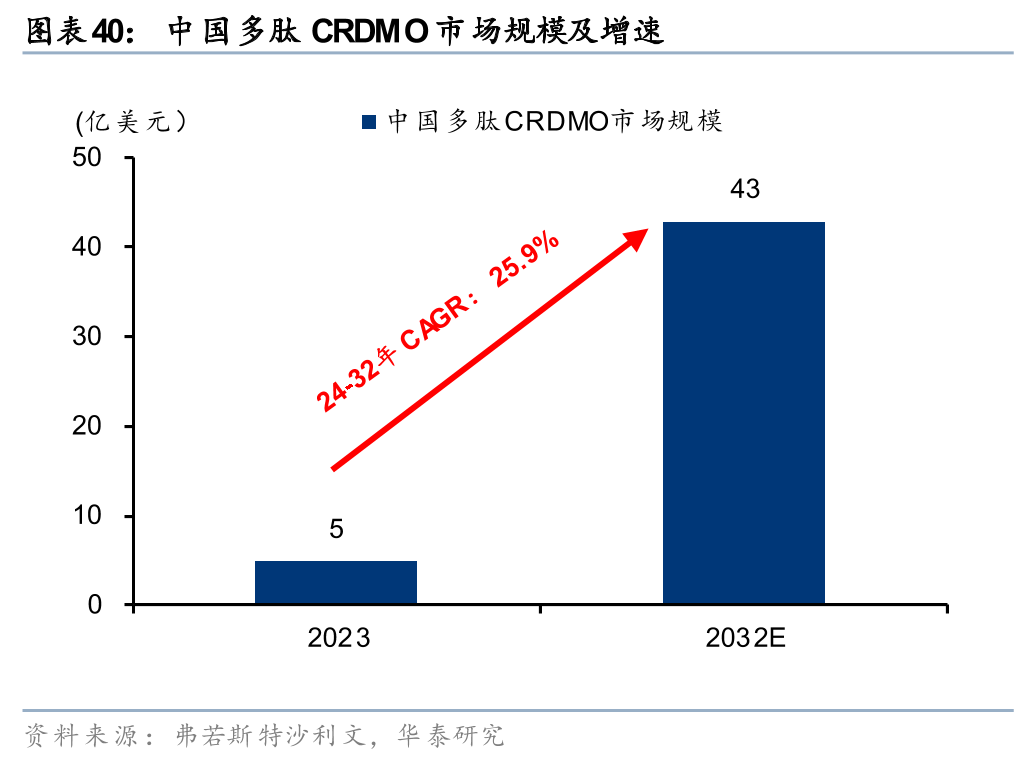 多肽CRDMO市场高速发展,增长动能充足。多肽药物领域研发及生产壁垒均较高,药企出于成本、风险、效率等考量对CRDMO服务商依赖度较高,主要体现在:1)合成及纯化困难:多肽类药物结构复杂,其合成涉及多个复杂的步骤及精确的反应条件(如识别及控制由二硫键产生的多环肽杂质长期以来一直是业内的重大难题),有效监测杂质及有效纯化API成为多肽药物开发的主要障碍;2)生产困难:将多肽药物的生产工艺从实验室规模扩大至商业生产规模存在重大难题,其涉及反应条件、设备的优化及生产工艺的调整,在最佳合成效率及高纯度水平之间取得平衡仍是一个持续难题;3)商业化困难:需满足不同国家及地区严格的药品监管政策(GMP认证等)。得益于此,多肽CRDMO实现了蓬勃发展。根据弗若斯特沙利文数据,全球多肽CRDMO市场23年规模31亿美元,其预计到2032年将达到188亿美元,24-32年CAGR达22.0%;中国市场增速更快,23年规模为5亿美元,其预计到2032年行业规模将达到43亿美元,24-32年CAGR为25.9%。