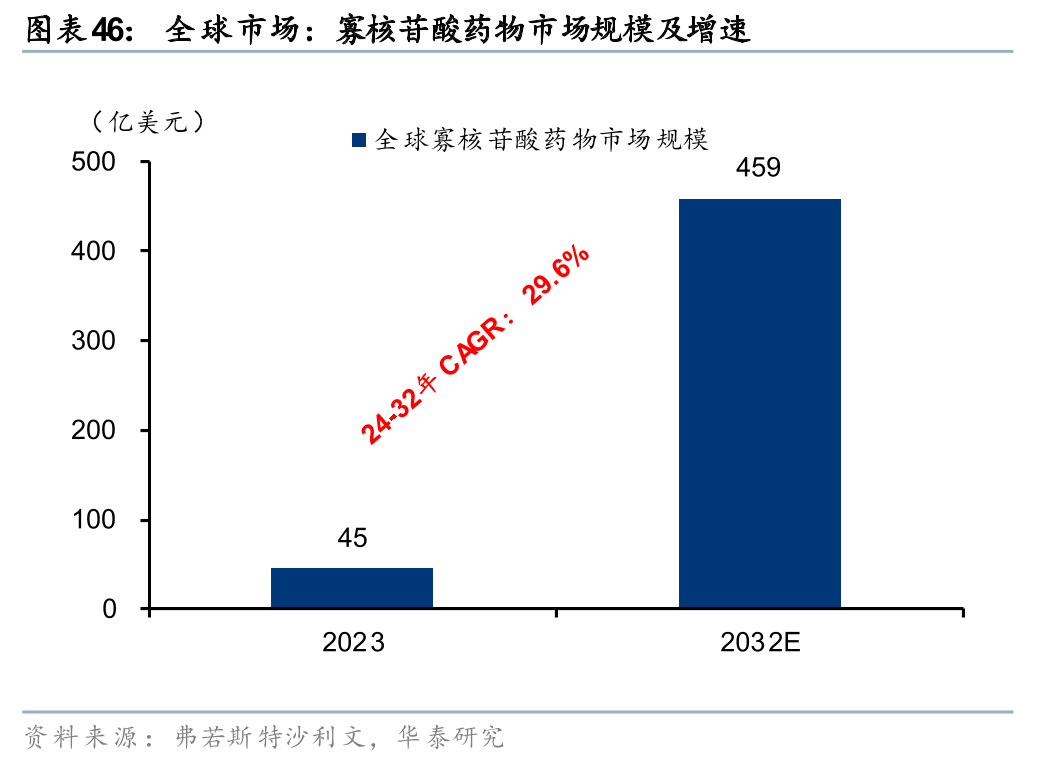 寡核苷酸药物市场快速增长。寡核苷酸指一类合成核酸聚合物,通常由约20个核苷酸的单链或双链分子组成。其用于通过各种机制调节基因表达,包括ASO、RNAi及核酸适配体等。目前全球范围已有多款寡核苷酸药物上市,主要适应症包括原发性高草酸尿症、原发性高胆固醇血症及神经退化疾病(如肌萎缩性脊髓侧索硬化症)等,其中销售收入最高的寡核苷酸药物为Ionis Pharmaceuticals, Inc.开发的一种ASO药物Spinraza (Nusinersen),其2023年全球销售额为17.41亿美元(根据泰德医药招股书)。寡核苷酸药物市场快速发展,根据弗若斯特沙利文数据,全球寡核苷酸药物23年市场规模为45亿美元,其预计到2032年将达到459亿美元,24-32年CAGR达29.6%;中国寡核苷酸药物23年市场规模为1亿美元,其预计到2032年将达到9亿美元,24-32年CAGR达28.7%。