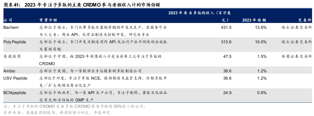 国产多肽服务商已跻身全球龙头地位。目前全球多肽CRDMO供应商主要包括Bachem、Polypeptide、Ambio、药明康德、凯莱英、泰德医药等,海外供应商中Bachem和Polypeptide相对领先,其23年全球份额分别为13.8%及10.0%。国产供应商中,药明康德24年TIDES板块(主要为多肽和寡核苷酸)整体收入已达8.15亿美元(规模超过Bachem的6.87亿美元、PolyPeptide的3.64亿美元,两者亦聚焦TIDES领域),已跻身全球多肽/TIDES CRDMO第一梯队;凯莱英及泰德医药等国产厂家亦加速追赶,如凯莱英1H25化学大分子(多肽、寡核苷酸等)收入3.79亿元,同比增长超130%;泰德医药1H25总收入2.54亿元,同比增长28.5%。