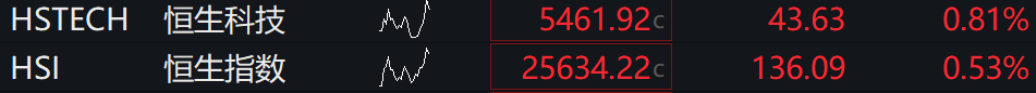 恒生指数高开0.53%,恒生科技指数0.81%。科网股普涨,网易、阿里健康、快手涨幅靠前;新能源车概念股活跃,小鹏汽车、零跑汽车走强。