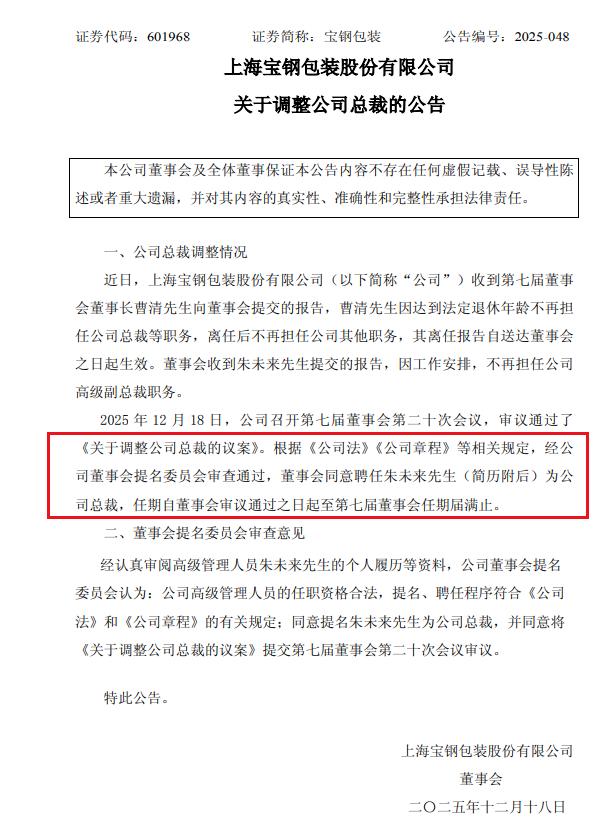 宝钢包装12月18日发布公告,近日,公司收到第七届董事会董事长曹清先生向董事会提交的报告,曹清先生因达到法定退休年龄不再担任公司总裁等职务,离任后不再担任公司其他职务,其离任报告自送达董事会之日起生效。董事会收到朱未来先生提交的报告,因工作安排,不再担任公司高级副总裁职务。经公司董事会提名委员会审查通过,董事会同意聘任朱未来先生为公司总裁,任期自董事会审议通过之日起至第七届董事会任期届满止。